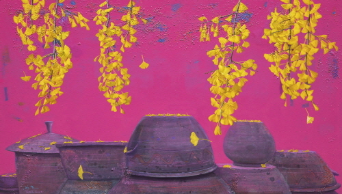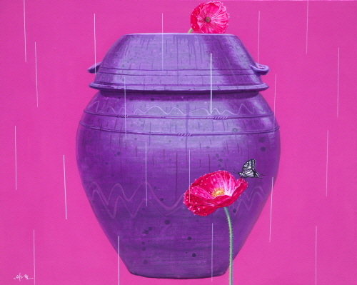 최근 작업에서 장독은 소재주의 입장에서 탈피하여 구성적인 측면을 중시하고 있다. 소재를 중심적인 이미지로 부각시키는 일반적인 구도와 달리 구성적인 요소에 국한시키는 것이다. 물론 장독 자체가 작품을 주도하는 것은 분명하지만 화면 가장자리로 밀어냄으로써 부수적인 소재처럼 보인다. 이는 그의 작업 자체가 소재를 중심적인 이미지로 내세우는 소재주의가 아님을 말해준다. 즉 화면 중심이 꽃이라든가 빗물이 흘러내리는 자국, 또는 비구상적인 이미지로 채워지는 데 따른 구성상의 묘미를 주시하겠다는 의도를 내포하고 있다. 이전의 작업에서 보여주었던 추상적인 이미지와의 조합과는 또 다른 사실과 사실의 조합인 셈이다. 그런데 여기에서 장독 이외의 넓은 공간을 차지하는 꽃이나 흘러내리는 빗물자국과 같은 이미지는 희미하게 표현된다. 선명한 이미지와 흐릿한 이미지의 조합이자 대비인 셈인데, 추상적인 이미지와의 조합에서 느낄 수 있는 긴장감이 그대로 이어지고 있다. 더불어 흐릿하게 표현되는 사실적인 이미지는 환상적인 분위기를 연출함으로써 꿈과 같은 몽롱한 기분을 느끼게 된다.