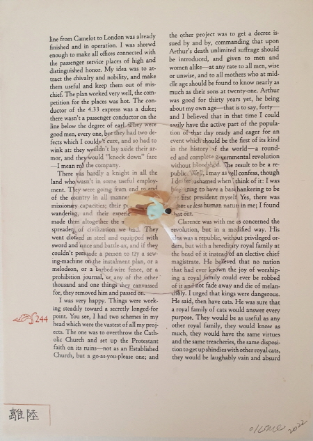 책은 우리에게 흔하고 친근한 물건 중에 하나이다. 그럼에도 점점 사라지고 있는 것 중 하나다. 책은 늘 소중하게 다루어야 하고 보관하는 것에서 위로와 감동, 정보와 재미의 보고에서 버려지고 폐기되는 대상이 되었다. 그리고 내게는 특별한 소재가 되었다. 내가 책을 작업 소재로 삼은 것은 인쇄된 깔끔한 색채와 이미지, 반복되는 배접의 형태와 손때 묻고 낡은 것들이 주는 조형미와 깊이감. 또, 놀랍도록 질이 좋은 옛 한지와 붓글씨가 만든 회화성. 거기에 선조들의 학문을 향한 위편삼절의 흔적들이 주는 감동. 이것이 나를 책 작업으로 이끌었다.