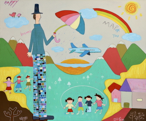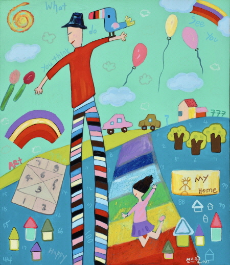 사람들은 희망이 보이지않으면 주저앉게 된다. 어린시절 우린 누구나 동심의 세계에 빠져 키다리아저씨를 떠올리며, 우스꽝스런 삐에로를 바라보며 긍정의 희망을 품어왔다. 현재, 성인이 된 나는 그림을 통해 어린시절과 소통을 이어나간다. 어렴풋히 기억나는 어린시절의 나로 돌아가 화폭에 크레파스로 낙서도 해보고, 손이 가는대로 그리고 마음이 가는대로 그림을 그리며 잊고 지냈던 희망을 다시금 떠올린다. 우리 모두는 희망을 꿈꾸는 사랑스런 존재가 되어야 하고 긍정의 에너지로 작품을 바라보는 관람자들 은 희망 을 갖고 행복한 모습으로 살아가기 를 기원한다.