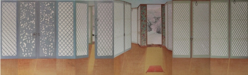 명상 (530x162cm) - 사유의 방 닫힌 문을 활짝 열고 새로운 시선으로 바라보면 빛의 세계가 저 방안의 깊숙한 곳까지 들어 올 것이다. 나는 이 작품을 구상하고 자료 수집을 하러 새벽 공기를 가르고 많은 사찰을 다녔다. 전통적인 문의 자료가 필요했는데 대부분의 집들은 편리하게 만들기 위해 변형이 되어 있어서 사찰로 방향을 돌린 것이다. 절마다 들어가는 초목의 종류가 다르고 분위기가 다르고 기운을 다르게 느꼈다. 아름다운 문양의 문이 많았으나 결국 단순미에 마음이 쏠렸다. 봄날의 햇살 아래 벚꽃이 흐드러지게 피고 사이사이 논밭이 보이는 정경은 나비의 꿈처럼 나를 상상의 세계로 이끈다. 이러한 표현의 재현적 요소를 통해 그것을 빠져나간다. 굳어진 관념을 벗어나 본질로 들어가는 것이다.