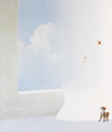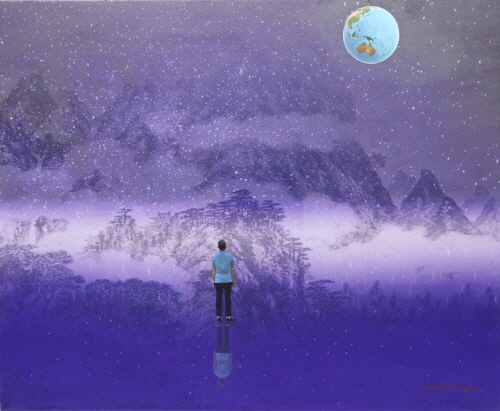 이러한 맥락에서 마치 르네 마그리트를 연상시키는 방식으로 화면에 등장하는 홀로 혹은 둘이 멈추어 서서 대자연을 관조하거나 혹은 서로 대화하고 있는 현대인의 형상은 과거와 현재 그리고 동양과 서양을 넘나들며 자유로운 시간여행을 하는 것 같은 느낌을 준다. 또 다른 작품에서 전통 가옥의 실내 모습과 열려 있는 문밖으로 보이는 자연의 모습 또한 마찬가지로 현 실생활과 이러한 정신적 세계로 이어지는 관조적, 명상적 분위기를 읽을 수 있다.