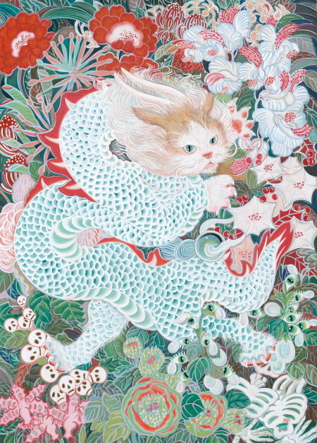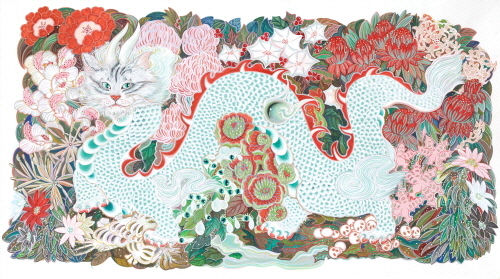 곽수연 作_서천꽃밭 묘룡(猫龍)_61x120cm_장지에 채색_2023