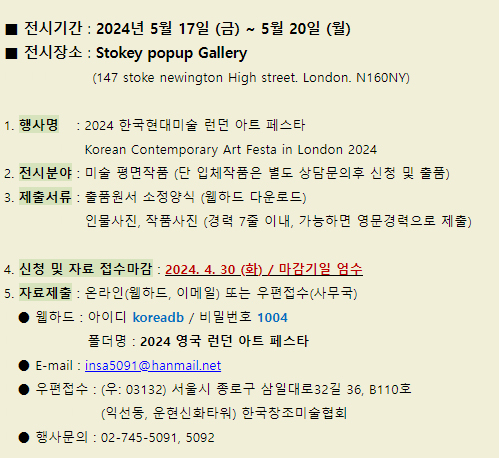 * 전시메일에 등록된 모든 이미지와 글은 작가와 필자에게 저작권이 있습니다. * vol.20240430-2024 한국현대미술 런던 아트 페스타 |