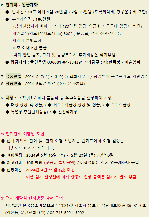 2024 한국현대미술 런던 아트페스타는 대한민국의 정신과 열정이 깃든 한국 현대미술 작품을 영국의 수준높은 예술과 문화를 이끌어가는 런던에서 펼쳐 보임으로써 영국 시민들에게 커다란 감동을 줄 것입니다. 또한 어려운 환경에서도 성실히 생활하는 한국 교민분들에게는 커다란 자긍심 고취와 더불어 조국을 기리는 뜻깊은 행사가 될 것입니다. 이번 행사에 역량있고 진취적인 작가분들의 많은 관심과 참여를 부탁드립니다.