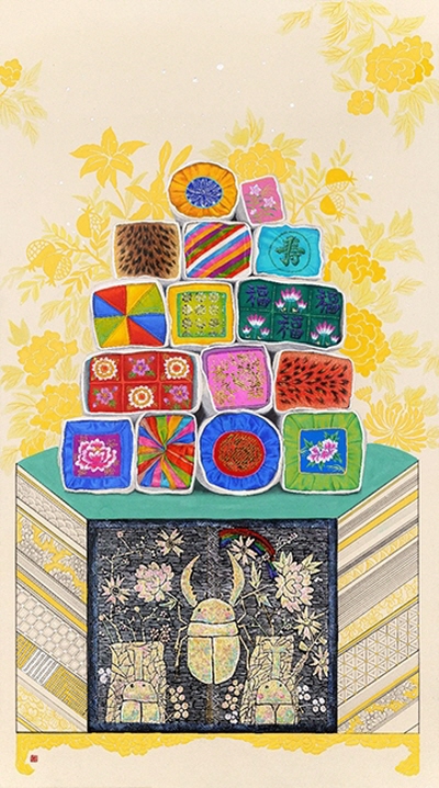 꽃2_한지에 석채, 분채, 자개_117x65cm_2023