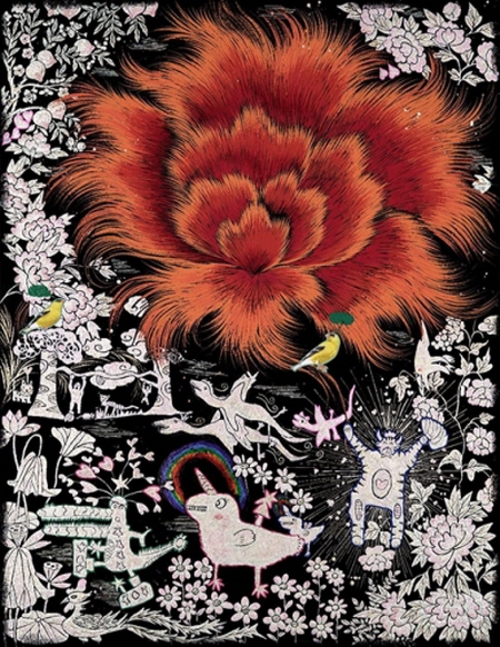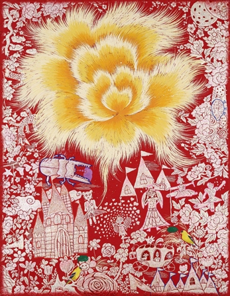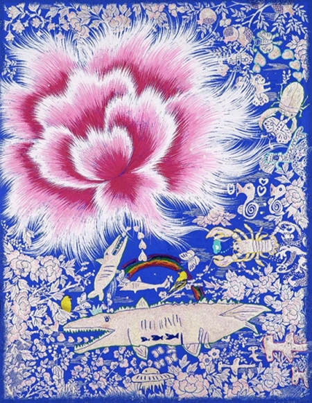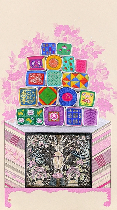 춤추는 모란_한지에 석채, 분채, 자개_145x112cm_2023