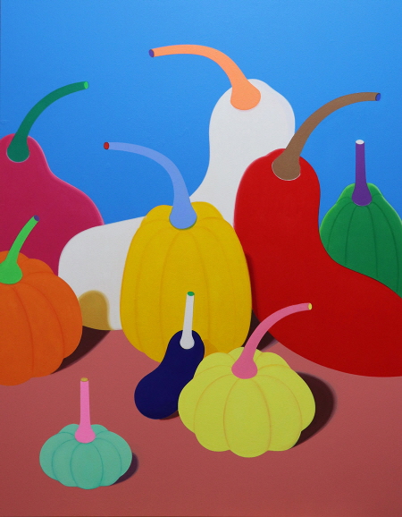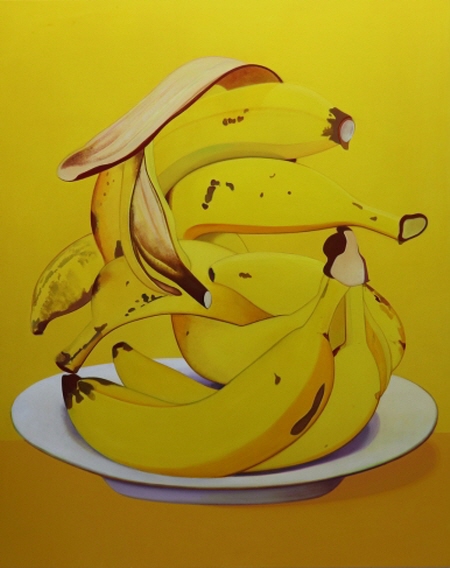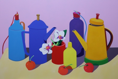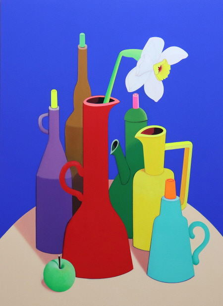 류제비의 화면은 형상과 색채로 구성됩니다. 그 중 우리는 색채에 먼저 집중하게 됩니다. 사물을 인식할 때 우리 지각에는 먼저 색이 들어오고 형상은 그 뒤를 따릅니다. 흰색 주전자, 파란 물병, 노란 바나나, 분홍 식탁보, 푸른 벽. 어느 사물이나 그렇습니다. 류제비의 그림에서도 우리 시선은 먼저 색에 닿습니다.