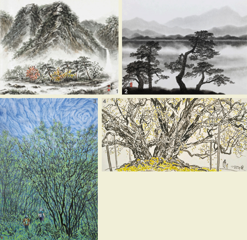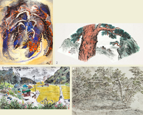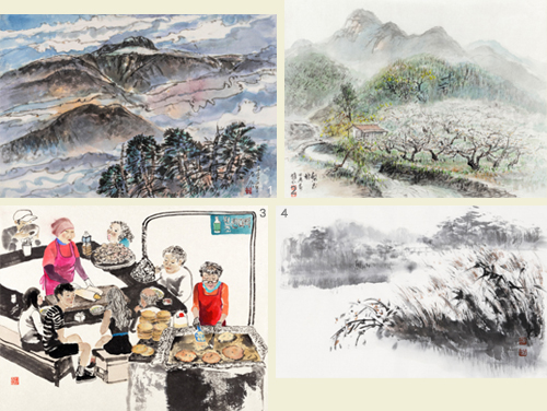 1. 이종상 作_원형상-고향마을_81×66cm_장지화 2. 이영복 作_氣(기)_32×63cm_화선지에 채묵 3. 이환범 作_추수철_46×76cm_화선지에 먹과 채색_2023 4. 권기윤 作_묵계 만휴정_49×70cm_한지에 수묵담채_2024