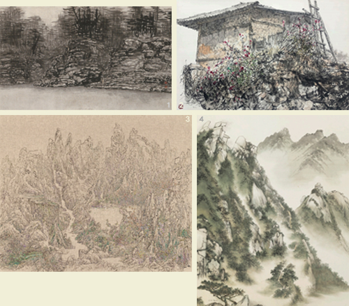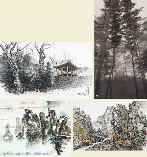 1. 강상복 作_心蘇亭(심소정)_48×75cm_한지에 수묵담채_2024 2. 권소영 作_Breathing forest 호흡하는 숲_75×40cm_한지에 수묵_2022 3. 김영희(항초) 作_도원 가는길에_75×96cm_화선지에 수묵 4. 김영암 作_주왕산_34×50cm_화선지에 수묵