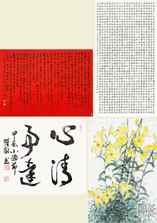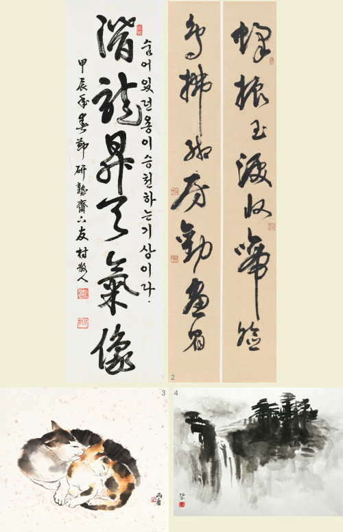 1. 박상현 作_潛龍昇天氣像(잠룡승천기상)_135×35cm_한지에 먹 2. 채순홍 作_봉진조불_127×18cm×2_화선지에 먹 3. 김동애 作_모정_47×55cm_한지에 수묵 4. 김외자 作_樂道_38×50cm_한지에 수묵담채