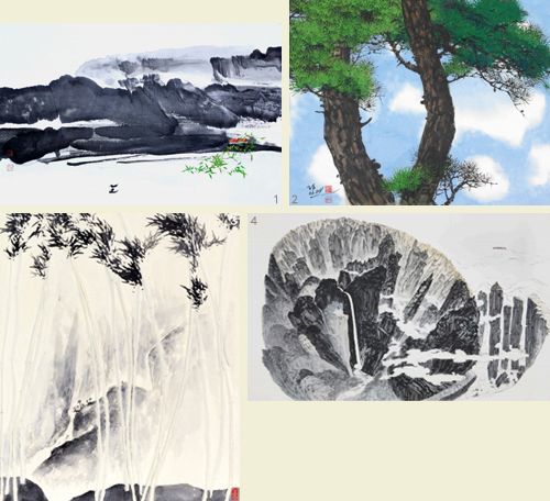 1. 이일구 作_호수의 아침_45×69cm_화선지에 수묵채색.아크릭_2024 2. 정숙모 作_靑松_37×47cm 3. 정응균 作_대바람소리_45.5×38cm_한지에 수묵 4. 제6회 안평안견창작상 수상 박대성 作_해금강_181×288.5cm_한지에 紙本水墨(지본수묵)