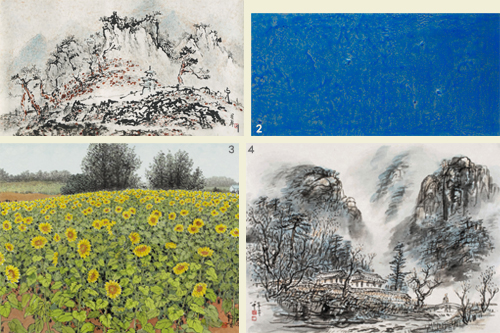 1. 한진만 作_한가_23×47cm_한지에 수묵담채 2. 김근중 作_Natural Being(新夢遊挑源圖)24-12_50.2×100.3cm_Pigment, Mixed Media on canvas_2024 3. 오용길 作_계절의 향기-해바라기_58×73cm_화선지에 먹과 채색_2023 4. 김문식 作_주왕유허(周王幽虛)_46×60cm_한지에 수묵_2020