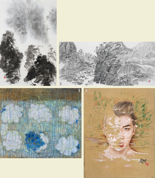 1. 권상호 作_몽유도원도 단상_47×69cm_한지에 먹 2. 이상서 作_장맹룡비(해서)천자문_118×65cm_한지에 먹 3. 김유연 作_心淸事達(심청사달)_33×35cm_한지에 먹 4. 곽자애 作_맑은 눈빛_70×45cm_화선지에 수묵담채