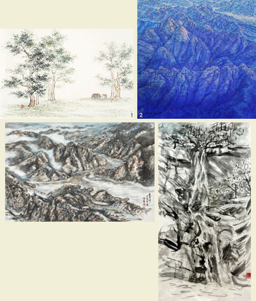 1. 안혜민 作_발길 돌려 다시 찾은 자리_48×59cm_한지에 수묵담채 2. 양정무 作_情景交融_강변의 표정_41×53cm_장지에 수묵_2024 3. 오민수 作_산수유람-거닐다_84×59cm_한지에 수묵채색_2024 4. 우용민 作_반계리 은행나무_38×64cm_한지에 먹_2023