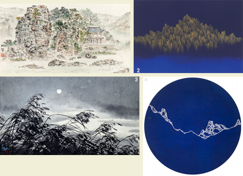 1. 정현희 作_거제일우(부분)_50×350cm_한지에 수묵_2024 2. 정형렬 作_상경(常景)_35×54cm_한지에 수묵담채_2024 3. 진리바 作_夢遊(몽유)_95×119cm_천에 먹, 석채_2022 4. 진희란 作_삼각만경_70×55cm_순지에 수묵담채_2022