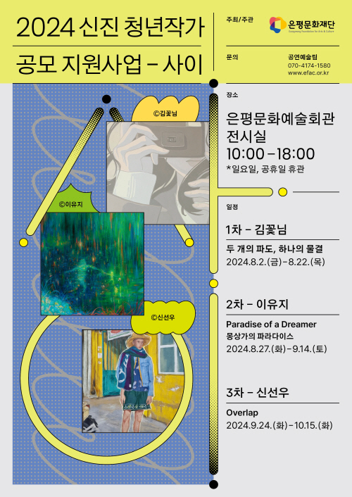 (재)은평문화재단(대표이사 장우윤)은 신진 청년 작가 3인(김꽃님, 이유지, 신선우)을 선발하여 8월 2일(금)부터 10월 15일(화)까지 은평문화예술회관 전시실에서 릴레이 개인전을 개최한다. 신진 청년 작가 공모 지원사업 <사이>는 매년 전국의 가능성 있는 시각예술 분야 신진 청년 작가를 선발하여 창작 활동을 지원하는 은평문화재단의 대표적인 전시 공모 사업이다. 8월 2일(금)부터 8월 22일(목)까지는 이번 전시의 시작을 알릴 김꽃님 작가의 <두 개의 파도, 하나의 물결>이 열린다. 한때 가장 가까이서 마음을 나누었지만 다시 만날 수 없는 사이가 되는 이별의 순간 찾아오는 거센 파도처럼 뒤섞이는 슬픔, 외로움 등 다양한 감정이 시간적 흐름에 따라 희석되는 과정을 시각적으로 담아, 관객을 위로하고 공감하고자 한다. 이유지 작가의 몽상가의 파라다이스)>는 8월 27일(화)부터 9월 14일(토)까지 열린다. 작가는 ‘상실과 애도의 감정에 대한 탐구로 꿈속의 새로운 세계를 찾는다’는 주제를 통해, 꿈속의 이미지를 통해 사랑을 잃은 경험의 아픔을 달래고, 예술의 주술적 힘으로 회복하는 여정을 담는다. 작품의 배경이 되는 상상의 쉼터인 ‘파라다이스’는 한국 전통의 강강술래, 서양의 연금술 등 동서양의 주술적 상징이 혼합된 이미지와 함께 조명을 통해 발광하는 형광안료로 묘사되어 신비로움을 더하며, 자유, 믿음, 해방의 메시지를 관객에게 전하고자 한다. 마지막으로 신선우 작가는 ‘덮다’, ‘중첩하다’, ‘겹치다’는 뜻을 지닌 ‘Overlap’이라는 단어를 주제로 시각예술 작품을 선보인다. 오늘날 교통과 통신의 발전으로 서로 연결된 세계에서 다양한 문화는 서로 중첩(Overlap)되어 융합하거나 동화되고, 때로는 새로운 성질을 창출한다. 작가는 이를 기반으로 관람객에게 새로운 소통 방식을 보여주고자 한다. 전시는 9월 24일(화)부터 10월 15일(화)까지 진행된다. 장우윤 대표이사는 “은평문화재단의 신진 청년 작가 공모 지원사업 <사이> 전시회가 은평구민들에게 폭넓은 시각예술 향유 기회를 제공하고 청년 작가들이 구민들과 예술로 소통하는 시간이 될 것이다.”라고 전했다. 2024 <사이> 전시 관람은 무료이며, 자세한 내용은 은평문화재단 홈페이지(www.efac.or.kr)에서 확인 가능하다.