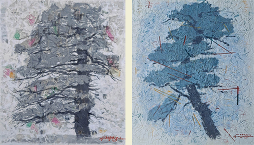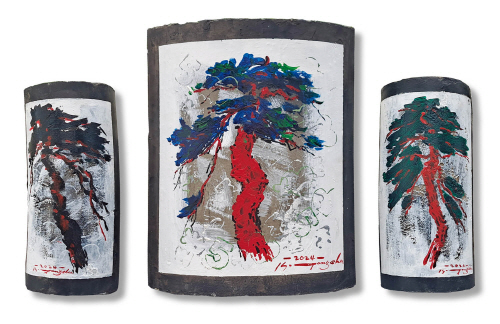 2024 도시나무-균형을 보다_72.7x60.6cm_stone and mixed media on panel (좌) 2024 도시나무-세월을 품다_72.7x60.6cm_stone and mixed media on panel (우)