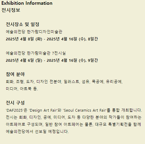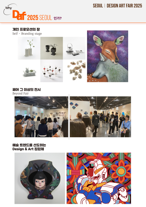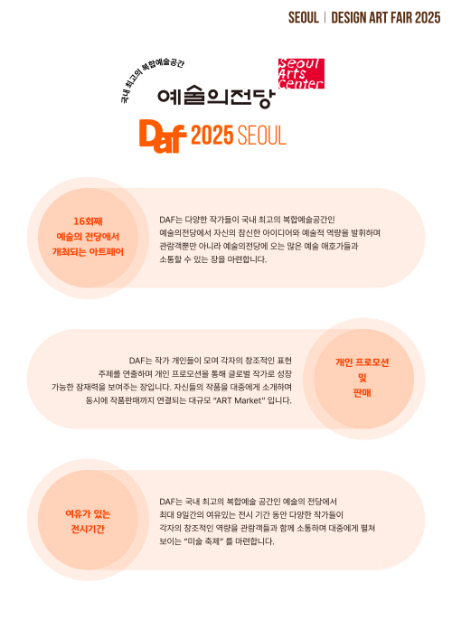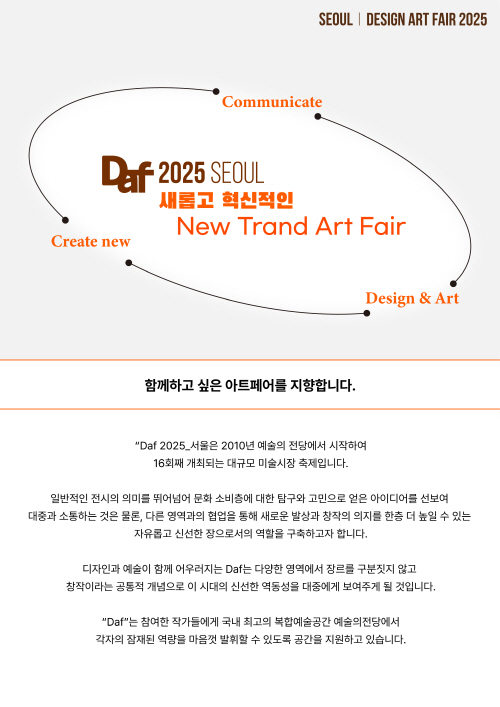 16주년을 앞둔 디자인 아트페어가 예술의전당 한가람미술관과 한가람디자인미술관 두 곳에서 진행합니다. 오랜시간 사랑받으며 운영된 디자인아트페어인만큼 이번에는 더 큰 규모로 많은 분들과 함께 할 예정입니다. 디자인아트페어 2025는 다양한 작품과 작가를 통해 일반적인 전시의 영역을 뛰어넘어 문화 소비층에 대한 탐구와 고민으로 얻은 아이디어를 대중들에게 선보여 소통과 함께 새로운 영역과의 협업들로 참신한 발상과 창작의 의지를 한층 더 높이는 자유롭고 신선한 장의 역할을 만들어 나가고자 합니다.