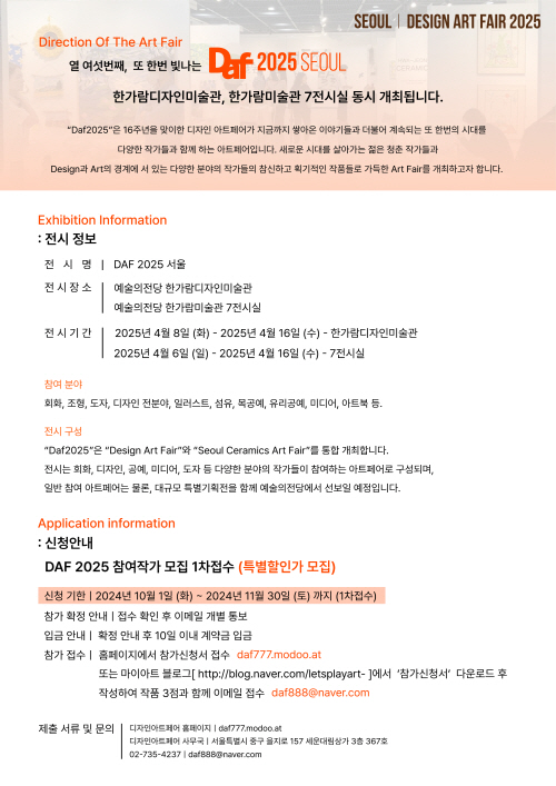 제출 서류 및 문의 | 디자인아트페어 홈페이지 https://daf777.modoo.at/ 디자인아트페어 사무국 : 서울특별시 중구 을지로 157 세운대림상가 3층 367호 T.02-735-4237 / daf888@naver.com