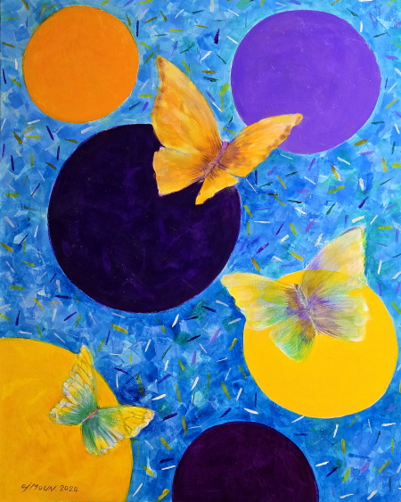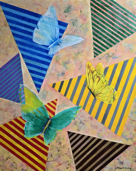 칸딘스키의 조형 언어 문법에 의하면 삼각형은 기본적 기하 형태에서 가장 역동적인 형상을 지닌다. 또한 삼각형은 매우 지적이고 성스러운 도형이며 종교적 의미에서 숫자 3은 성 삼위일체를 의미하는 신성한 것이다. 그녀는 삼각형을 통해 역동성과 자유로움을 표현하면서도 그것이 지닌 도전성과 모험이라는 불안전성을 포용한다. 종교적으로 삼각형이 신성을 말한다면 사각형은 인간적인 것을 의미한다. 사각형은 긍정적으로는 고요와 휴식, 공동체 의식이나 소속감을 주는 반면 부정적으로는 폐쇄적이거나 답답한 공간이나 심지어는 감옥과 같은 의미를 가지고 있기도 하다. 사각형은 그녀의 그림에서 오버랩핑으로 선명해지는 색과 함께 드러나는 형태로 고요와 불안을 아우르며 경계를 넘나든다. 원은 인류 문화에서 주로 신과 초월자를 상징했다. 원은 완성과 영원성을 상징하며 모든 것을 감싸는 것과 연관하여 어머니의 상징이기도 하다. 원은 그녀에게 나비라는 하나의 생명체를 탄생시키는 거대한 자궁이며 초월자의 눈이기도 하다. 그녀는 나비의 불안전성과 도형의 안전성을 대비시키며 내적 긴장감을 주고 도형의 다양한 배치를 통해 율동과 리듬을 만들어 낸다. 내적 필연성은 예술의 외적 필연성으로부터의 해방과 자율적인 형태로 나타난다고 했던가. 형태를 벗어나 비워진 틈은 텅 비었으나 충만하다.