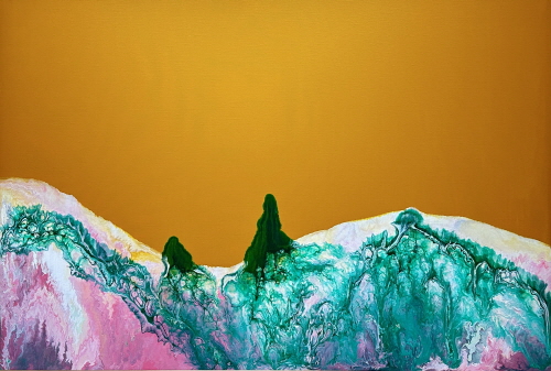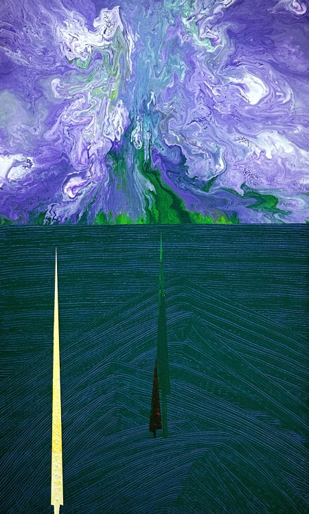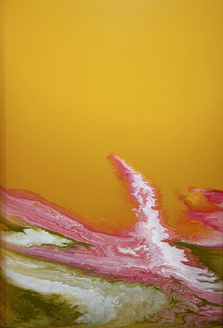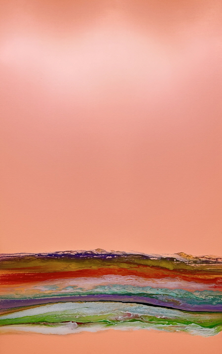 정 작가의 색채는 신비롭다. 우주의 파장으로 이루어진 오로라와 같고 깊은 땅 속에 묻힌 오팔 광석처럼 생명력과 우주적 리듬을 전달하는 도구로 화폭에 옮겼으며, 물질적 한계를 초월하여 영혼의 진동을 표현했다. 색의 중첩과 층을 통해 그는 무한한 차원의 인간 존재의 근원적 에너지를 시각화하는 데 망설임이 없는 구도자 같다.