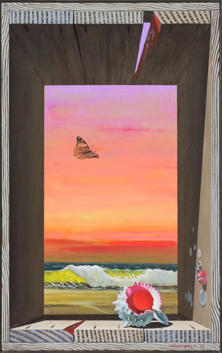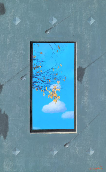 황학만의 작품세계는 극사실적 초현실주의 화풍을 견지하며, 작품 속에서 우리의 상실한 세계를 조명하는 하고자 것이 그 특징이다. 표현방법에 있어서 작품에 설정한 창틀은 상실한 세계를 연결하는 통로로서 초현실적 표현기제다. 또 하나의 세계가 인간의 잠재의식 속에 있다고 보는 것이다. 그러므로 창밖 해변의 창공은 작가가 꿈꾸던 염원의 메타포로써 내밀히 잠재된 세계다. 1987년 나는 그를 위하여 이런 글을 쓴 적이 있다. 「···황학만의 그림에 등장하는 새, 나비, 과일, 풍경 등의 이미지들은 우리 눈에 익숙한 듯 하면서도 우리들이 상실해온 사물들이다. 황학만이 보여주는 사물들은 다시 되찾아야 할 우리들의 시선을 일깨워주고 있으며, 메카닉하게 버려진 우리들의 생활정서로 하여금 다시 꿈꿀 수 있는 권리를 부여함으로써 개개인의 고립감을 극복시킨다.」(‘상실되어 가는 꿈에의 조명’중에서) 과연 우리는 무엇을 상실해가며 무엇을 얻고 있는가? 대부분의 시선들은 새롭게 등장하는 것에만 주목하고 있을 뿐 사라져가는 것은 까맣게 있고 있다. 망각은 우리들의 과고와 추억, 망각의 세월 속에 묻힌 자화상에까지 적용된다. 어느 사이에 우리는 자신이 살아왔던 길까지를 잊어버리고 만다. 황학만의 그림은 그러한 아쉬움을 일깨워 주며 과거에 품었던 희망과 꿈을 소생시키고, 그것들을 사물의 임지 형태로 회화적 복권을 실현시킴으로써 예술이 우리들의 삶에서 무엇인지, 무엇이 되어야 하는지를 생각게 해준다. 자세히 들여다보면 빛바랜 판자 위의 녹순 못 자국이나 긁힌 흔적을 소중하게 다룬 사실성을 발견케 되고, 그 너머로 보이는 푸른 하늘과 무심해 보이는 흰 구름역시 그가 개발해 낸 회화적 언어이며, 그것이 자신을 둘러싼 일상에 대한 관심을 환기시키며 삶에 대하여 떨칠 수 없는 애착과 그 허무를 반영하는 것이라는 사실을 알게 된다. 모든 아름다운 것은 허무하다. 그러나 그것이 아름답게 다가오는 한 허무는 견딜만한 것이다.