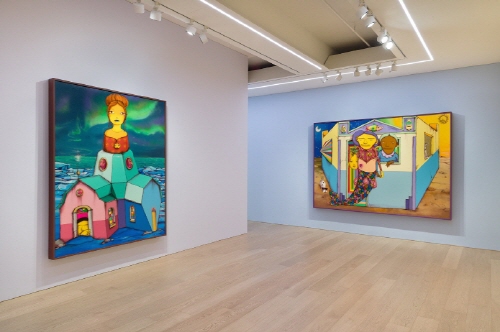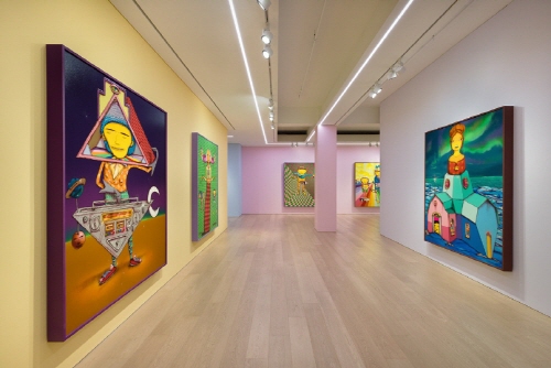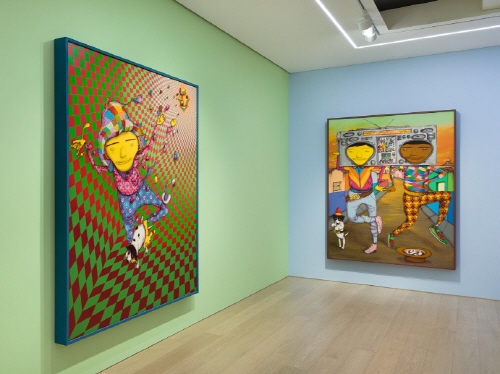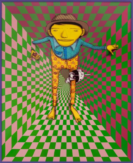 '꿈의 포털'이라는 전시 제목은 작가들이 자신의 작품을 일종의 포털, 관문 또는 거울로 인식한 것에서 비롯되었다. 이를 바탕으로 그들의 작업은 평면 안에 존재하는 다양한 차원에 대한 탐구가 핵심이다. 예를 들어, <오 마이 갓!> (2023)에서는 작가의 상징적인 노란 캐릭터가 마치 포털을 통과하는 것처럼 평면을 가로질러 나선형으로 떨어지는듯 하다. 한편 <센세이션>(2024)은 보이지 않는 거미줄에 걸린 듯한 인물이 앞에 있는 관객의 공간으로 들어오려 시도하는 역동적인 모습을 묘사한다.