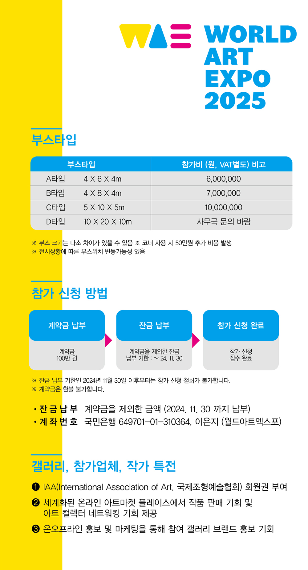 >> 전시 관람 신청 방법 전시 관람 신청은 현장 티켓 구매 및 사전 등록 신청으로 진행됩니다. 온라인 전시 관람 신청은 월드아트엑스포 공식 웹사이트(www.wae.co.kr)를 통해 가능하며 2025. 1. 10(금) 까지 신청 시 사전예약 혜택가로 티켓 구매가 가능합니다.