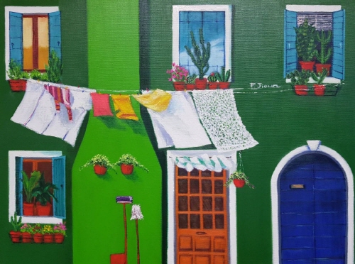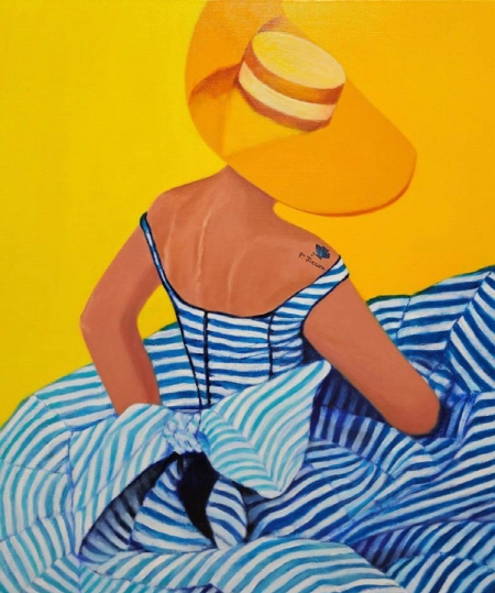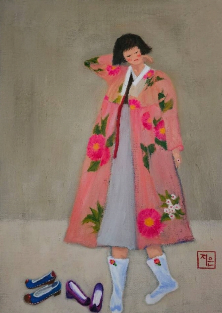 평상시 내가 좋아하고 관심있는 Fashion, Structure(건물), Cactus(선인장) 등 고전적인 유화에서 생각하는 풍경, 정물 등의 주제보다는 정형화되지 않은 주제들을 강렬한 색상을 사용함으로써 내제된 자유로움을 표현하고 싶다. 한(韓)시리즈는 패션화보에서 개량한복을 입고 있는 생기발랄한 아가씨를 보다 한복이라는 주제가 넘 재미있을거 같았다. 단발머리 컨셉은 평상시 주로 하고 있는 내 머리스타일이다. 다 그리고 보니 기존 영문 사인과는 어울리지 않는다는 생각이 들었다. 작품의 마지막을 장식할 사인의 위치나 색상 등 사인 하나에도 생각이 많아지기도 한다.그러다 낙관이 잘 어울릴 것 같았다. 빨래시리즈는 이태리 BRANO의 강렬했던 햇살과 컬러풀한 건물들, 거기에 널려있는 빨래들을 재미있게 표현해보고 싶었다. 사인은 재미있게 빨래줄에 널어봤다. 새로운 작품을 시작할 땐 유난히 더 설렌다. 어떻게 표현이 될지? 또 어떤 색감들로 서로 어우러질지? 그 중간중간에 또 어떤 재미있는 것들을 넣어갈지?
