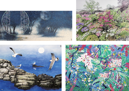 1 전병운 作_가족_95x41cm_장지 먹 채색 나전(자개)옻칠_2024 2 오희자 作_서원 뜰_50F_화선지에 수묵담채_2024 3 이차영 作_달과 새가 노니는 곳_50F_장지채색_2020 4 이인금 作_비밀의 화원_30F_장지채색_2020