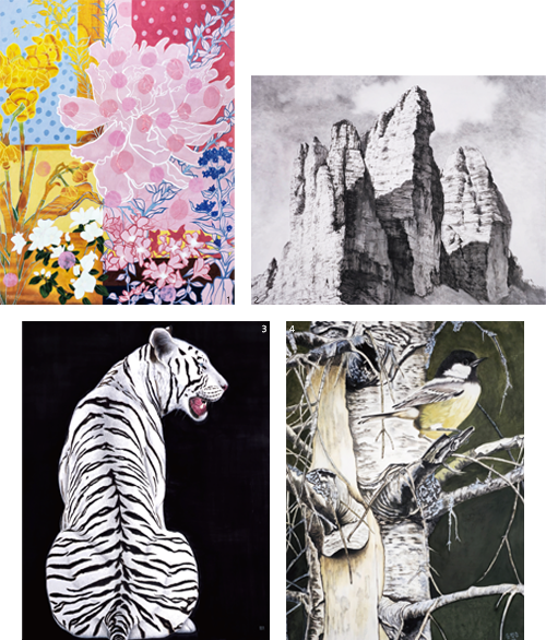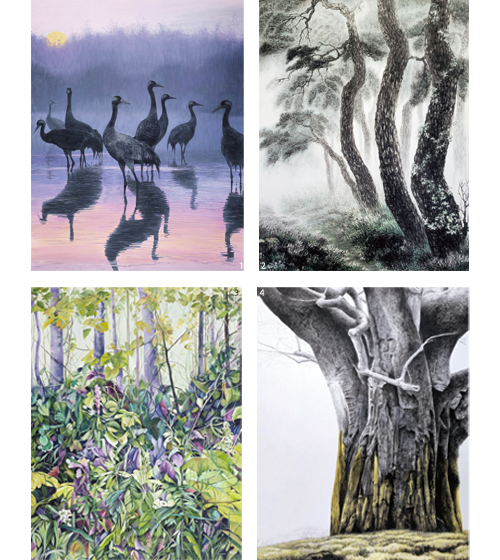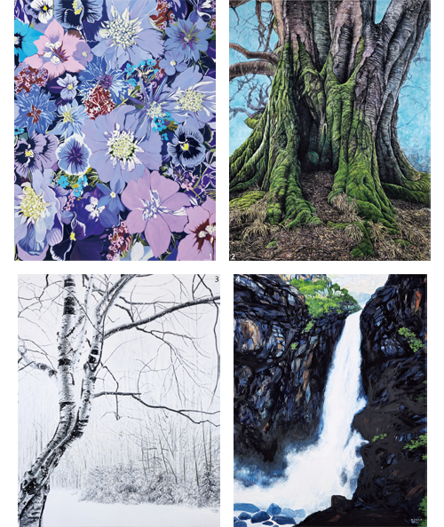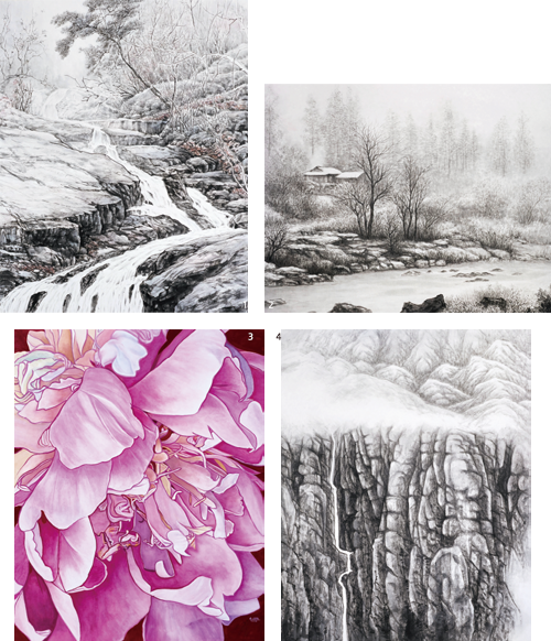 1 임현숙 作_우아한 자태_50F_장지채색_2024 2 장보남 作_궤적_50F_장지에 수묵채색_2024 3 박명옥 作_설화_30F_장지채색_2024 4 노연호 作_자연의 힘_50F_장지채색_2024