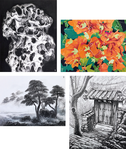 1 이정숙 作_사유의 꽃_50F_장지채색_2024 2 맹완영 作_태고의 흔적_50F_장지수묵_2024 3 송규이 作_돌아온 전설_50F_장지채색_2024 4 송정순 作_대춘(待春)_50F_장지채색_2023