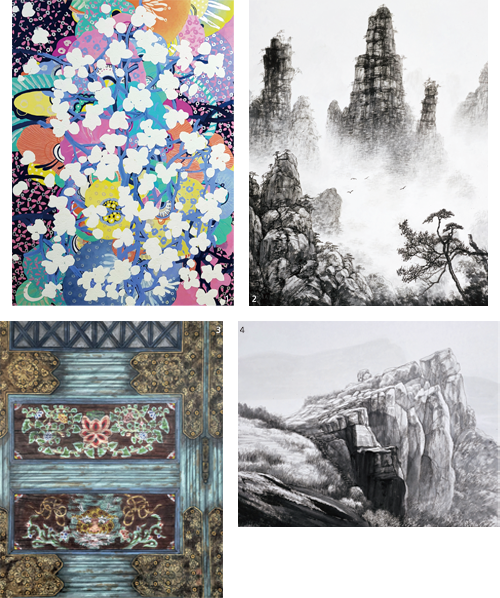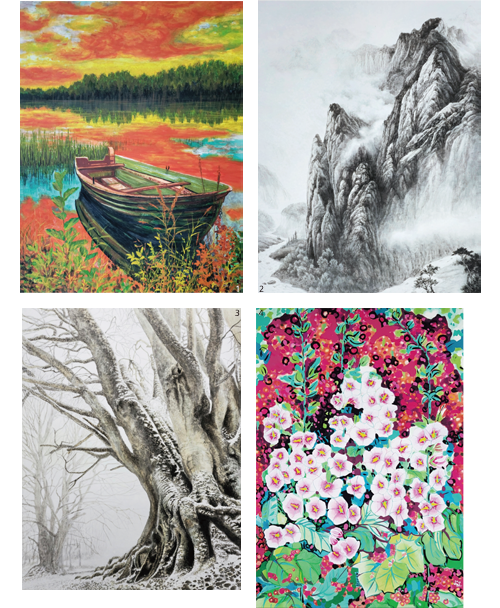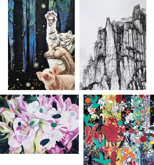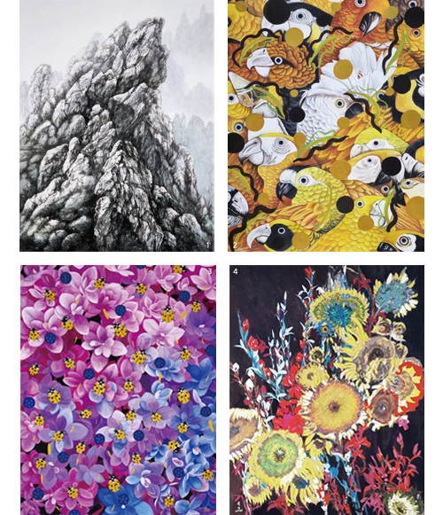 1 채경화 作_화율(花律)_60F_장지채색_2020 2 이찬배 作_심산유곡1_50F_장지수묵_2024 3 장병건 作_고색창연_30F_장지채색_2022 4 고갑석 作_적요_30F_장지수묵_2024
