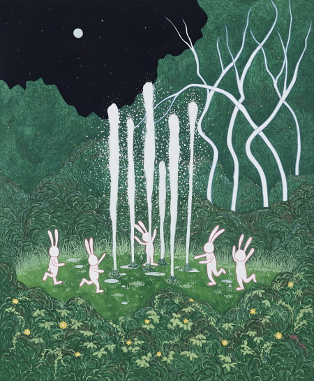 김재현 작가는 자연에 받은 인상을 그린다. 시시각각 변하는 자연, 숲 안에서 보았을 때와 숲 밖에서 보았을 때의 차이, 그리고 상황에 따라 다양하게 빛나는 나무들을 보며 감동한 느낌을 캔버스에 재현하고자 한다. 김지연 작가는 얼굴 없는 토끼가 노니는 몽환적인 자연을 그리며 이상적인 공간을 향한 여정으로 우리를 초대한다. 이목구비가 없는 토끼는 애착 인형을 모티브로 하여 어른이지만, 내면은 아이 같은 나의 자아를 표현한다.