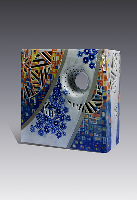 기하학적인 구조물, 즉 평면에 가까운 직육면체나 넓적한 직육면체를 구부려놓은 듯싶은 구조물 중간 양쪽에 구체 모양으로 볼록하게 솟은 투각이 절묘하게 어우러지는 작품이 있다. 이들 작품은 견고한 구조도 그러하거니와 두터운 유약 및 발색이 무척 아름답다. 밍크 컬러 그리고 새크라멘토 그린 유약이 도자기에서 그처럼 아름다운 발색을 나타낼 수 있다는 게 신기할 정도이다. 이들 작품은 현대 도조에 쓰이는 유약에 관한 관심을 불러일으킬 만한 시각적인 아름다움을 보여준다. 무엇보다도 안정감이 느껴지는 견고한 구조물에 깃들인 투각 이미지는 매우 세련된 조형미를 갖추고 있다는 점에서 인상적이다. 그런가 하면 평면 구조에 직접 투각과 채색을 곁들임으로써 시각적인 즐거움을 주는 작품도 있다. 유채색으로 표현한 꽃이나 기하학적인 이미지 그리고 투각 이미지를 보태 짐짓 화려한 장식성이 강조된다. 호랑이나 말 등 일련의 동물 형상을 표현하는 작업은 세부를 생략한 간결한 형태이다. 실재하는 동물의 재해석이지만 상상의 동물 형상도 있다. 이들 작업은 유아적이거나 동화 또는 우화적인 요소를 덧붙임으로써 스토리를 내재한다. 어린아이의 시각에서 볼 수 있는 친근하고 정겨운 형태미를 가지고 있어 재미를 유발하는 것도 볼거리 가운데 하나이다. 도조 작업에 색깔을 도입하는 건 자연스러운 일이 되고 있다. 컬러 티브이가 선도하게 된 현대인의 색채감각은 도예나 도조뿐만 아니라 회화의 변화를 촉진하고 있을 정도이다. 밝고 발랄한 시각적인 인상을 주는 화사한 원색적인 색채이미지는 우리 생활공간에 깊숙이 침투하고 있다. 그는 이와 같은 색채에 관한 현대인의 감정반응을 작업에 반영하는 것을 자연스럽게 받아들인다.