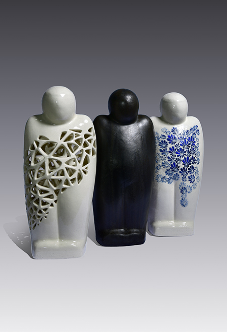 이와 함께 장식적인 그림이나 부분적으로 투각기법을 도입한 인물상은 눈코입이나 손가락과 같은 부분에 관한 묘사를 지양하여, 지극히 간결한 구조이다. 머리를 살짝 굽혀 인사하는 듯한 모양이라든가, 손발을 몸에 일체화시키는 형태가 있다. 몸통에 투각을 넣고 나뭇잎 문양으로 장식하기도 하며, 검정 단색만으로 표면 처리한 작품도 있다. 또한 한복을 입은 여인의 모습이나 아이를 품에 안은 여인상도 보인다. 부분적으로 투각이 들어가 있는데 자연스럽게 어울린다. 이들 인물상은 마치 나무처럼 곧게 선 형상으로 단정하고 단아할뿐더러 힘이 느껴진다. 이 모두 흙으로 빚어졌다는 점에서 손끝의 감각이 그대로 전해져 온다. 나무나 돌을 이용한 조각상과는 다른 온기가 느껴지는 것도 이 때문이다. 도조는 도예와 마찬가지 작업 과정을 거친다. 흙을 사용하기 때문이기도 하지만 무엇보다도 유약과 같은 재료로 표면을 처리하고, 고온에서 구워내는 방식은 예나 다름없다. 다만 형태적인 면이라든가 실용성에서 도예와는 또 다른 길이 있다. 어쩌면 순수 조형이라는 점에서는 조각에 근사하다고 할 수 있고, 예술적인 가치를 추구한다는 점에서 서로 다르지 않다. 재료와 고온에서 굽는 방식이 다르다. 따라서 고온 소성은 사금파리와 같은 견고한 물질로 바꾸어내는, 일종의 연금술과 같은 과학적인 기술의 총합이라는 점에서 도조는 독자적인 표현 영역이다. 그의 작업은 전통적인 도자기와 소조 작업을 절충하고 통합하는 방식으로 작업한다. 그러기에 도자기와 조각이 결합한 형태의 자연적인 순수한 맛과 멋을 지니고 있다. 여기에다 실용성을 가미함으로써 현대인의 생활공간에 적합한 조형미를 실현하고 있다.