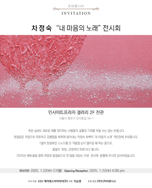2025. 1. 22(수) ▶ 2025. 1. 27(월) Opening 2025. 1. 22(수) pm 4 서울특별시 종로구 인사동길 34-1 | T.02-736-6347 주최·주관 | KSII 대표 이순영 | 후원·협찬 | (주)디티이큐시스