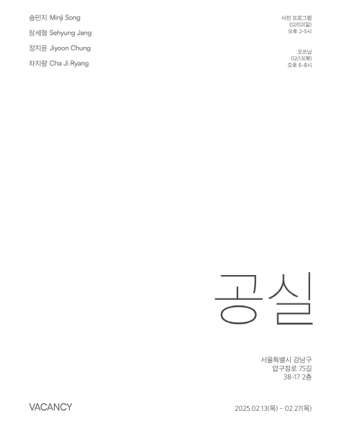 오는 2월 13일(목), 송민지, 장세형, 정지윤, 차지량 작가가 참여하는 기획전 《공실 Vacancy》가 오픈합니다. 《공실 Vacancy》는 이전 세입자와 다음 세입자 사이의 공백 속에 잠시 멈춰있는 청담동 105-4의 물리적 구조와 임시적 성격을 활용해 이를 전시의 공간으로 전환합니다. 전시는 건물주의 가장 큰 골칫거리로 여겨지는 ’공실‘을 창조적 탐구의 출발점으로 삼아 현대인이 느끼는 낯선 ’공(空)‘의 상태를 정면으로 마주하며, 이로부터 발견할 수 있는 가능성을 조명하고자 합니다.