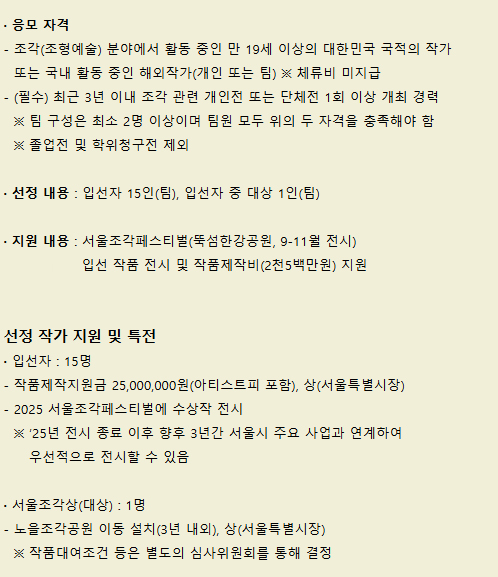 서울특별시는 조각가들의 실험적인 작품 활동 지원과 시민들의 일상 속 예술 경험 확장을 위해 2025 조각도시서울 프로젝트의 일환으로 도심 문화공간 ‘뚝섬한강공원’에서 2025 서울조각페스티벌 개최를 위한 제2회 서울조각상을 공모하오니 역량 있는 작가들의 적극적인 관심과 참여 바랍니다.