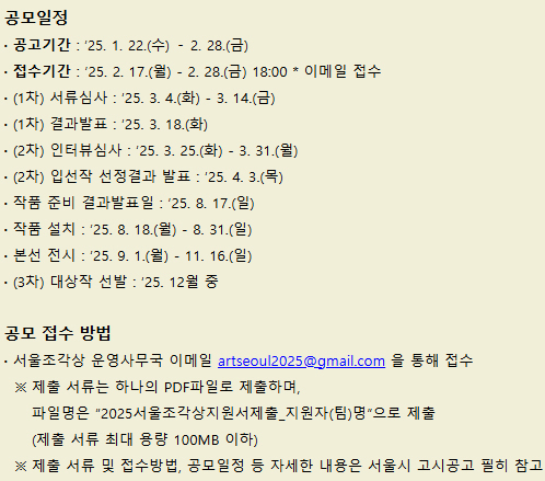 * 전시메일에 등록된 모든 이미지와 글은 작가와 필자에게 저작권이 있습니다. * vol.20250217-제2회 서울조각상 공모 |