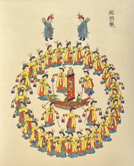 권필선 作_궁중무용 선유락_55x46cm_지본채색_2024 화려하게 채색된 배를 둥글게 에워싸고 돌면서 <어부사(漁父詞)>를 부르며 추는 춤을 그린 그림