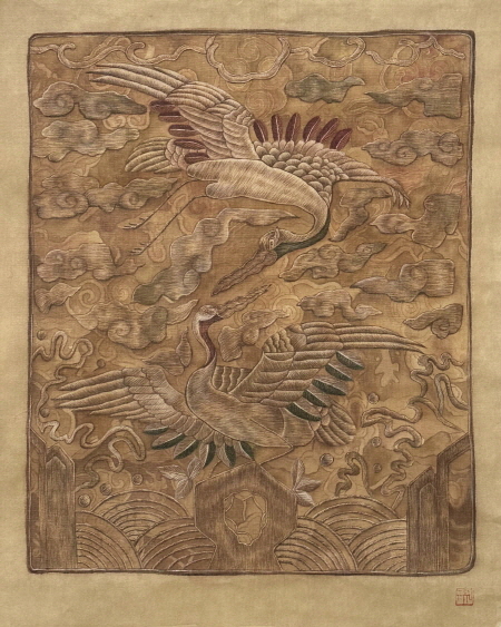 황지원 作_쌍학 흉배_38x53cm_견본채색_2023 조선시대 문관의 관복 앞뒤에 부착한 쌍학 흉배_석주선기념 박물관소장 출토 유물 모사작