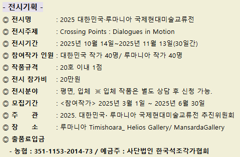 2025. 대한민국∙루마니아국제현대미술교류전 작가모집 2025. Korea ∙ Romania International Modern Art Exchange Exhibition