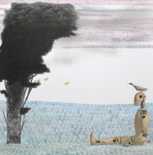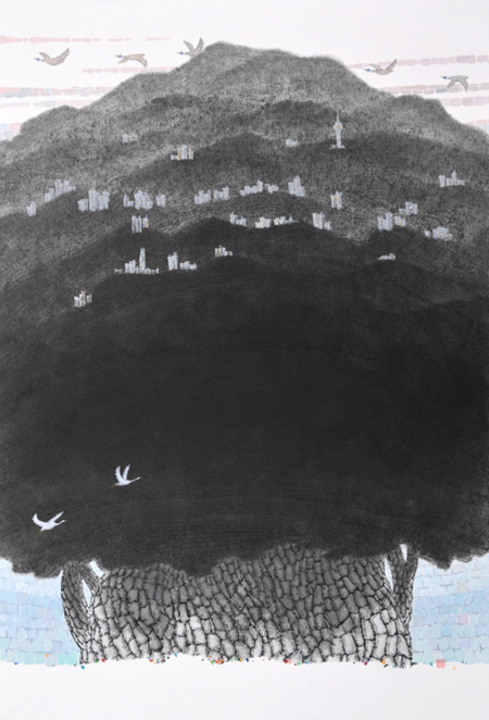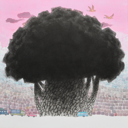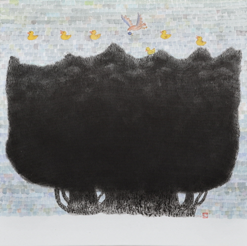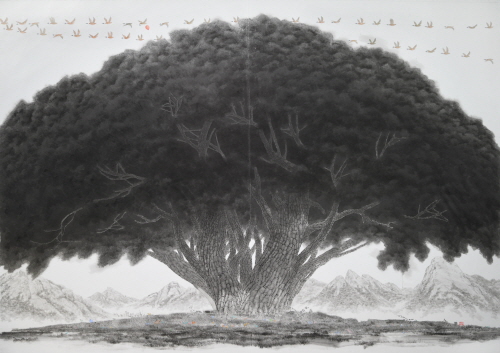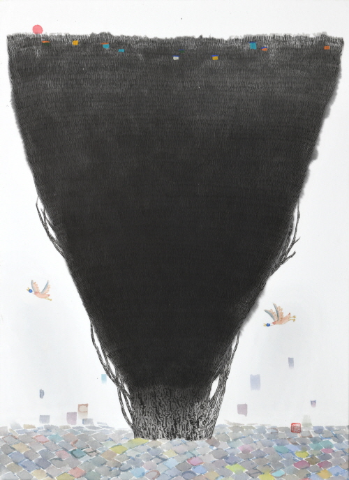 수묵화를 바탕으로 자연과 인간의 관계를 현대적으로 해석하였다. 강렬한 검은 나무의 형태와 주변의 밝고 다채로운 요소들이 대조를 이루며, 자연의 본질적 에너지와 인간의 삶이 어떻게 연결되는지 암시한다.