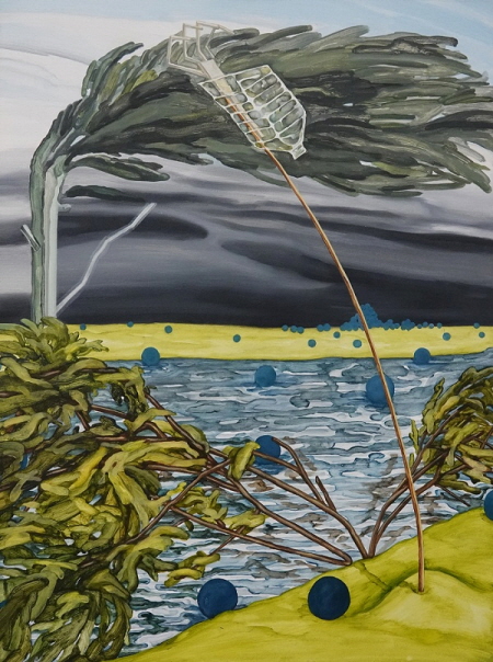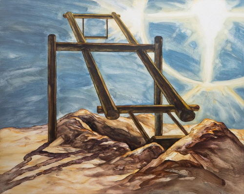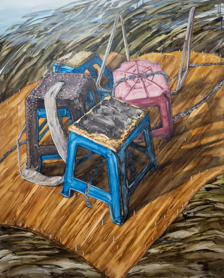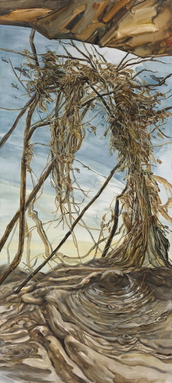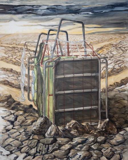 안주은이 주목하는 것은 결국 생의 의지와 염원이 어떻게 일상의 사물을 통해 형상화되고 또 얼마나 밀접하게 우리의 삶에 맞닿아 있는가에 대한 탐구이다. 작가는 오래된 사찰이나 손때 묻은 유물뿐만 아니라, 한철을 버티기 위해 세웠던 가림막이나 작물 지지대에 남은 흔적 속에서도 동일하게 보편적인 생의 의지를 발견한다. 그리고 과거와의 접점을 통해 그것이 어떻게 진화하며 다음 세대로 이어지는지를 탐색한다. 이러한 접근은 작품의 재료와 표현 방식에서도 드러난다. 수성 유화물감의 얇고 가벼운 텍스처는 구조물들이 지닌 임시적이고 연약한 특성을 반영하며, 유기적이고 과감한 붓질로 표현된 주변 환경은 작가의 상상력이 더해진 가상의 공간으로 재구성된다. 이를 통해 작가는 단순한 재현을 넘어 시간이 남긴 흔적과 기억을 시각적으로 형상화한다.