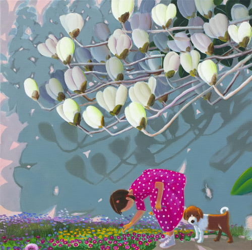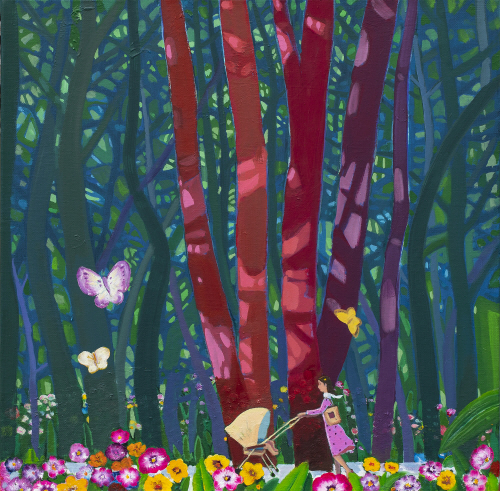 이 그림은 구체적인 풍경을 재현한 것이 아니라 색/물감만이 화면 가득 펴져있다는 인상을 우선적으로 안겨준다. 다양한 색상의 조화로 채워진 그림이자 순도 높은 색채의 화음을 실현하고자 하는 작업에 해당한다는 생각이다. 작가는 일정한 면을 색채, 붓질로 채우고 있고 단속적인 붓질로 마감하고 있는데 그것들이 문득 잎사귀와 꽃들을 지시한다. 동시에 같은 방식으로 나무와 인물, 강아지 등이 표현되고 있다. 개별 형상에 따른 구분이 일어나지만 전체적으로는 색채들 간의 차이를 발생시키면서 밀고 나간 흔적이 더 강하다.