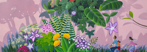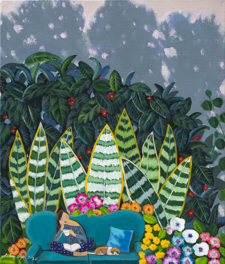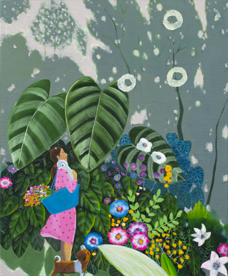 넓은 평붓으로 시원하게 칠해나간 자취와 다채로운 색면들로 직조된 화면은 캔버스의 평면성을 인식시킨다. ‘동양화에서 엿보는 일획으로 마감한 빠른 붓놀림’(작가노트)의 자취 또한 그 주변으로 흩어져 있다. 붓질의 흔적이 유난히 강하게 다가온다. 커다란 잎사귀를 묘사하고 있는 부분의 경우에는 납작하게 칠한 색면을 중첩시키면서 배경으로 점차 그 형태들이 사라지는 편이다. 붓질이 퍼져나가면서 공간 안으로 지워지는 형국이다. 그것이 원근을 대신하면서 평면 안에서 나름 공간의 깊이를 만들어내고 있다. 동시에 단일한 색면으로 마감된 배경 역시 평면성을 강조하면서도 무한한 공간감 및 밝고 화사한 자연의 기운이 가득한 공간의 힘을 겨냥하고 있다. 한편 넓은 잎들 사이로는 원형과 별의 형상을 지닌 꽃들이 두툼하게 칠해진 물감의 물성과 예민하게, 촉각적인 붓질로 인해 생동감 있게 출몰한다.