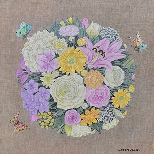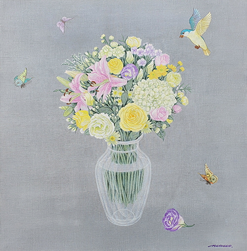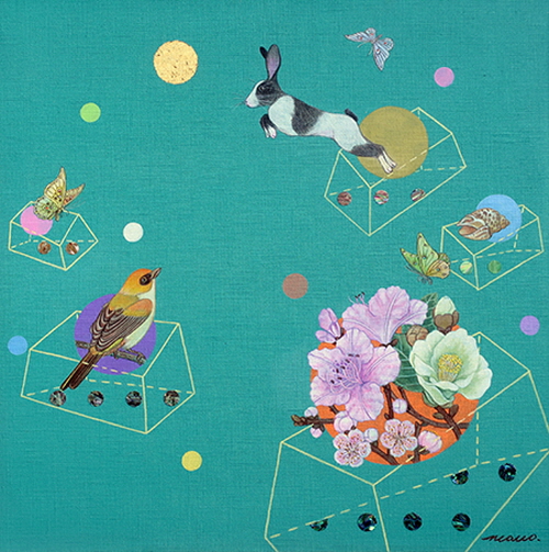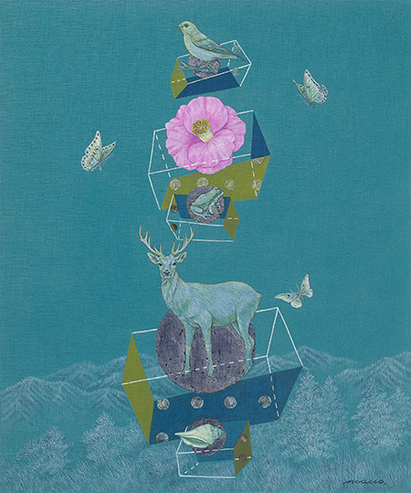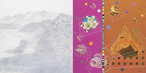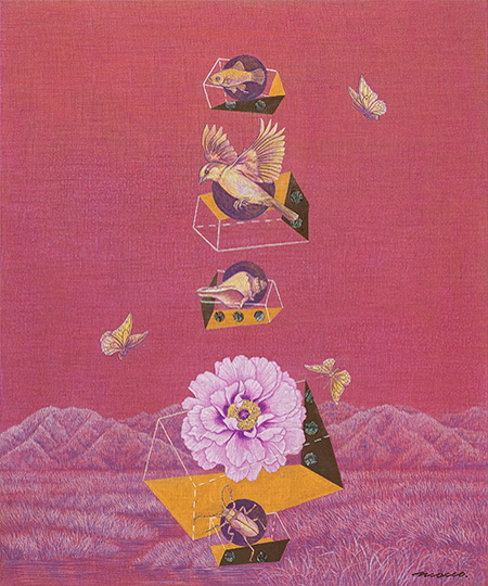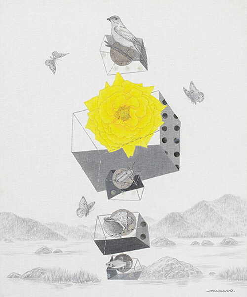 초현실 세계의 구성 〈자연-순환-이야기〉 2001년부터 시작된 〈자연-순환-이야기〉는 순환하는 자연속의 질서를 다루고 있다. 그림에는 크게 3개의 주인공이 있다. 꽃과 나무 등 식물, 나비와 새 등 공중을 부양하는 동물 그리고 고둥 및 소라 등 어패류다. 그리고 원형의 자개 조각들이 배열된다. 나비는 주로 꽃 주변을 맴돌며 미(美)를 한껏 탐하고 있다. 소라는 그림의 여백에 조용히 존재한다. 자개는 오브제이면서도 그림과 이질감이 없이 세련됨을 더한다. 모든 조합이 자연스럽다. 평범한 풍경의 한 장면 같지만 현실세계가 아니다. 땅에서, 하늘에서, 바다에서 살아가는 생명들이 한 화면에 공존하기 때문이다. 또한 바람이 멎은 듯 흔들리지 않는 풀과 꽃, 원색과 파스텔톤의 강렬한 배경은 초현실적 분위기를 더한다. 작가의 상상 속 세계이자 환상의 세계인 것이다. 작가는 우주만물을 구성하는 생명의 요소들을 조화시켜 자연속의 질서를 그렸다. 그리고 초현실적 화면을 통해 자연의 순리를 미적 방법으로 전달한다. 이는 향후 〈자연-경계〉작업의 중요한 토대가 된다.