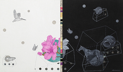 차원의 확장 〈자연-경계〉 작가는 2014년부터 〈자연-경계〉라는 주제를 통해 자신의 작품세계를 더욱 확장시킨다. 〈자연-경계〉는 앞선 〈자연-순환-이야기〉 그리고 〈공감-채집〉의 요소를 집대성하면서도 현대적 요소를 가미한 시리즈다. 표면적으로 가장 큰 차이점은 도형 형태를 한 기하학적 요소의 등장이다. 투명한 듯 보이는 다각형은 작가의 초현실 공간 속에 또 다른 가상공간을 설정한다. 선이 만나 면을 만들고, 면이 모여 공간을 만드는 것은 조형원리의 기본이다. 하지만 조현동의 작업에서는 면이 조합돼 완성된 다면체의 형태가 중요한 것이 아니다. 그보다는 각각의 면들이 보유한 세계에 주목해야 한다. 어떤 면 위에는 꽃이 피어나고 사라진다. 또 어떤 면은 동그란 자개들이 경계선에서 연속성을 잃고 끊어진다. 최근 작업에서는 격자무늬로 표현되거나 수묵화의 풍경이 면 안으로 들어오기까지 했다. 각 면은 도형을 이루기 위한 파편으로 존재하는 것이 아닌 각각 다른 세계의 일면들인 것이다. 또한 차원을 넘나드는 경계로 기능한다. 다면체뿐만 아니다. 배경에 무늬처럼 존재하는 원색의 원에도 새와 나비가 드나든다. 마치 차원 이동이 가능한 웜홀(Wormhole) 같다. 이로써 작가는 자신의 세계를 캔버스 화면 안에 가두기보다 원과 사각의 면을 통해 외부로 확장시킨다. 다면체는 단지 조형 요소의 추가가 아닌 미적이고 철학적인 시선의 확장이자 조형적 확장의 시도다.