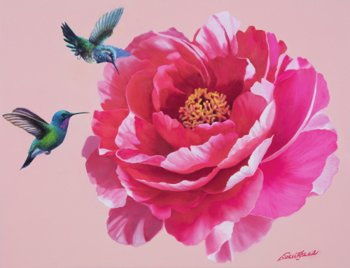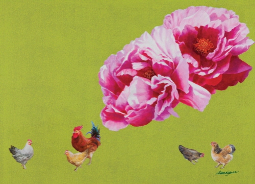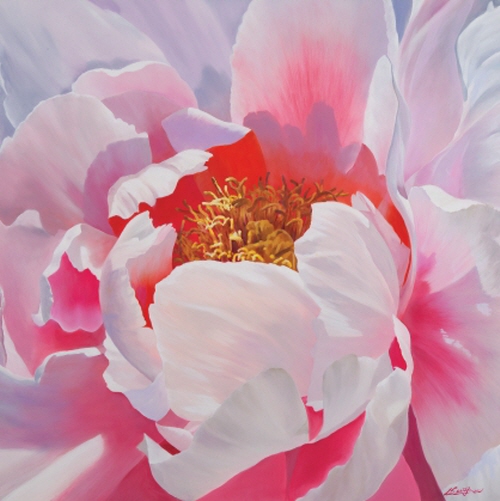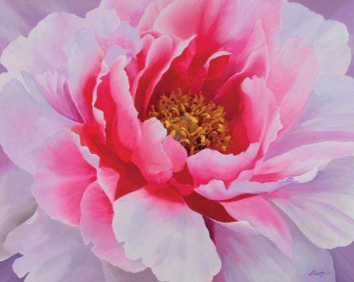 모란의 꽃말은 부귀영화다. 꽃 중의 꽃으로 상징화되는데 모란의 꽃술! 노랑 빛깔은 사랑의 핵이고, 꽃잎 하나 하나가 열리는 순간을 순간을 묘사하는 게 “그림의 정수(精髓)”라 여기고 화폭에 붓질을 무수히 하여 형상화 하는 작업이다. 모란은 꽃이 화려하고 위엄과 품위를 갖추고 있다고 하여 ”부귀화(富貴花)“라고 불릴 정도로 부귀영화의 상징이자, '꽃 중의 왕'으로 여긴다. 문헌상으로 모란은 장미와 함께 인간이 오랜 세월에 걸쳐 좋아하는 최고 최상의 으뜸 미(美)로 간주(看做)했다. 모란은 흰색, 분홍색, 빨간색, 주황색, 보라색, 노란색 등 다양한 색깔을 가지고 있다. 그중 노란 모란은 흰 꽃과 붉은 꽃에 비해 키가 작고 꽃도 작다. 흰 모란꽃이 제일 크고, 그다음이 붉은 모란이다. 앙증맞게 제일 작은 꽃이 노란 모란이다(*작가의 많은 모란 작품 중 ”신비하다“라는 제명을 가진 게 바로 그 모란이다). 특히 모란의 노란 꽃술은 햇빛을 연상시키며 희망, 낙관, 긍정적인 에너지를 창출한다. 또한 노랑 꽃술의 황금 곧 재물을 상징하며 부와 명예, 그리고 풍요로움을 나타내는 색깔로 여겨지기 때문에, 모란을 사랑하는 핵심이라 주장할 수 있다.